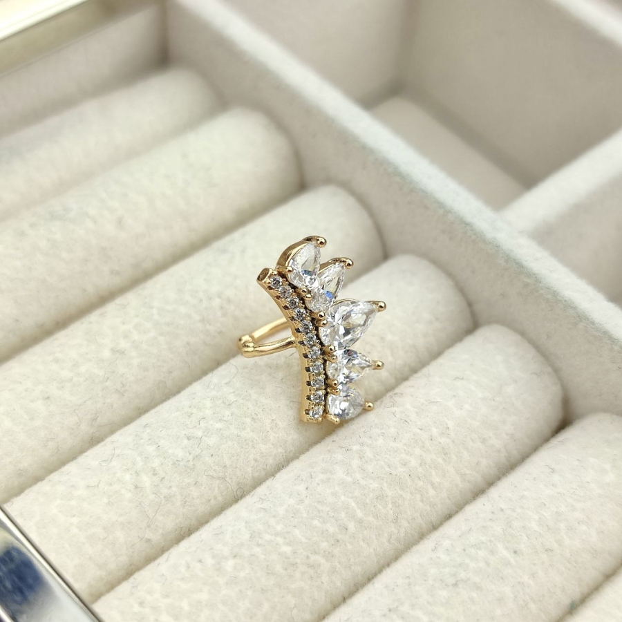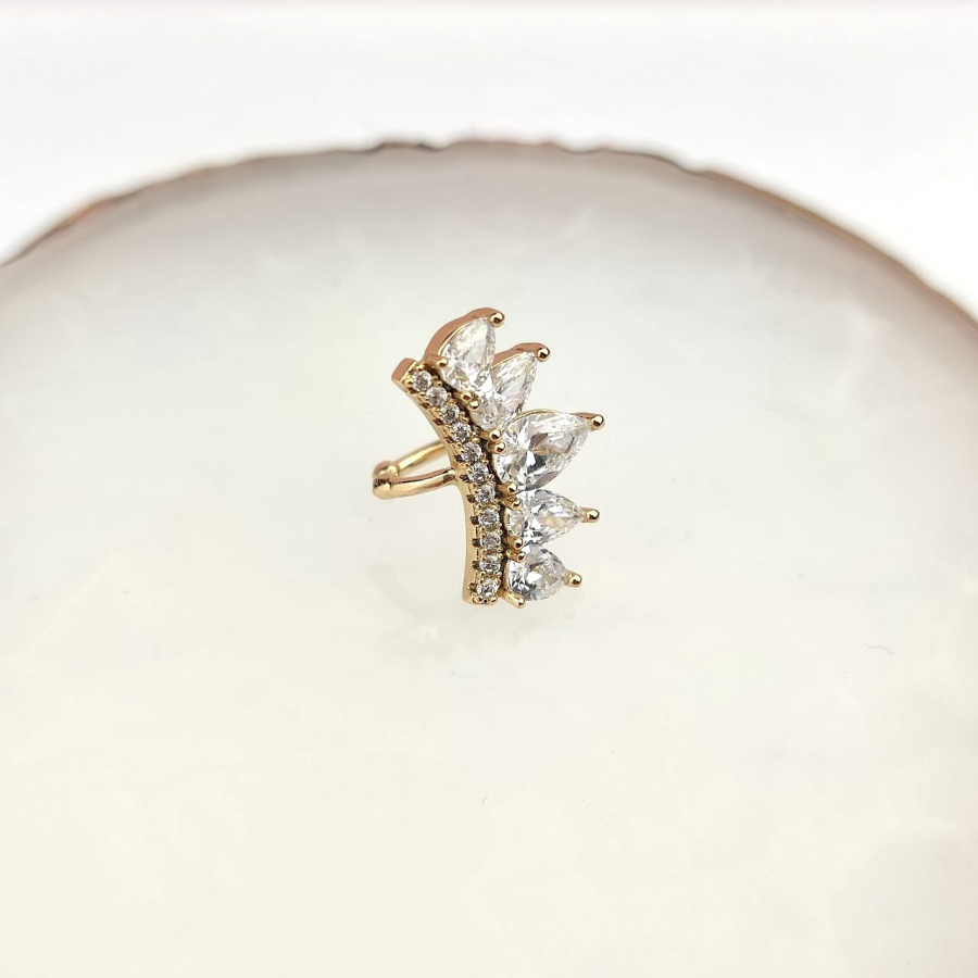Biżuteria pozłacana, trzykrotnie pokryta warstwą 18-karatowego złota. Nausznica, którą zaciskany sobie w dowolnym miejscu na uchu, nie wymaga posiadania przekłutego ucha. Wielkość 2 cm.