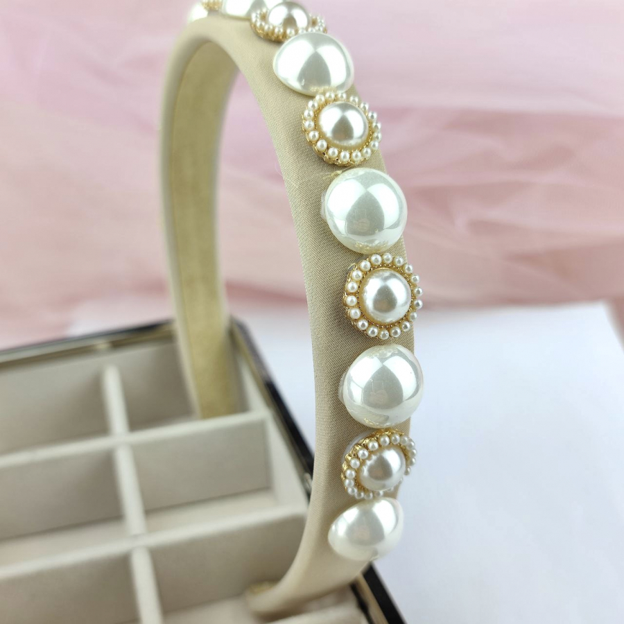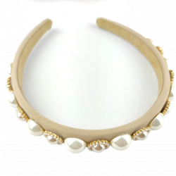 Opaska do włosów o ekskluzywnym wyglądzie, bogato ozdobiona perełkami. Od spodu obszyta zamszowym materiałem, co czyni ją wyjątkowo delikatną dla naszych włosów. W jasnym, beżowym kolorze.