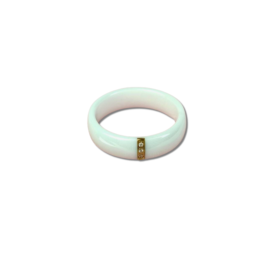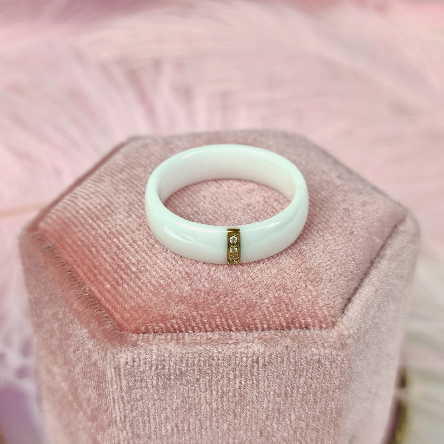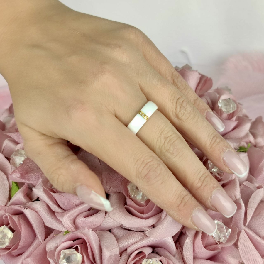 Biżuteria wykonana jest z najwyższej jakości stali chirurgicznej 316, która nie czernieje, nie uczula i jest w 100% hipoalergiczna. Pierścionek gładki, ceramiczny w kolorze białym, ozdobiony pośrodku pasem cyrkonii.