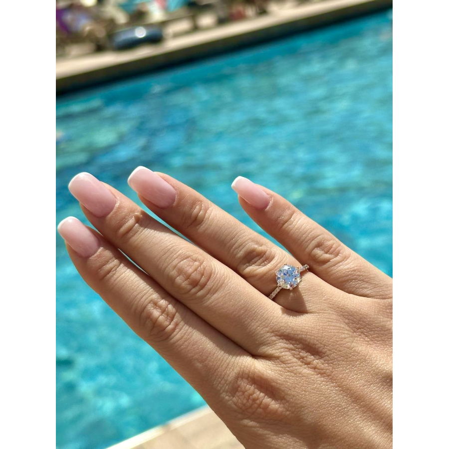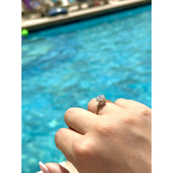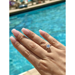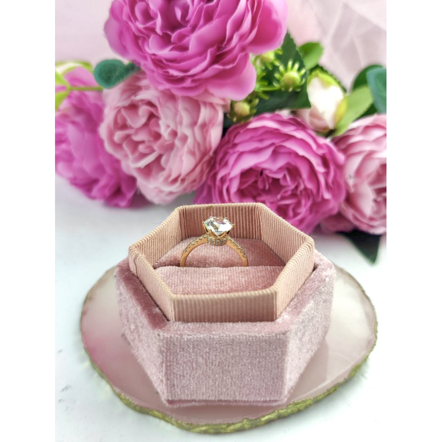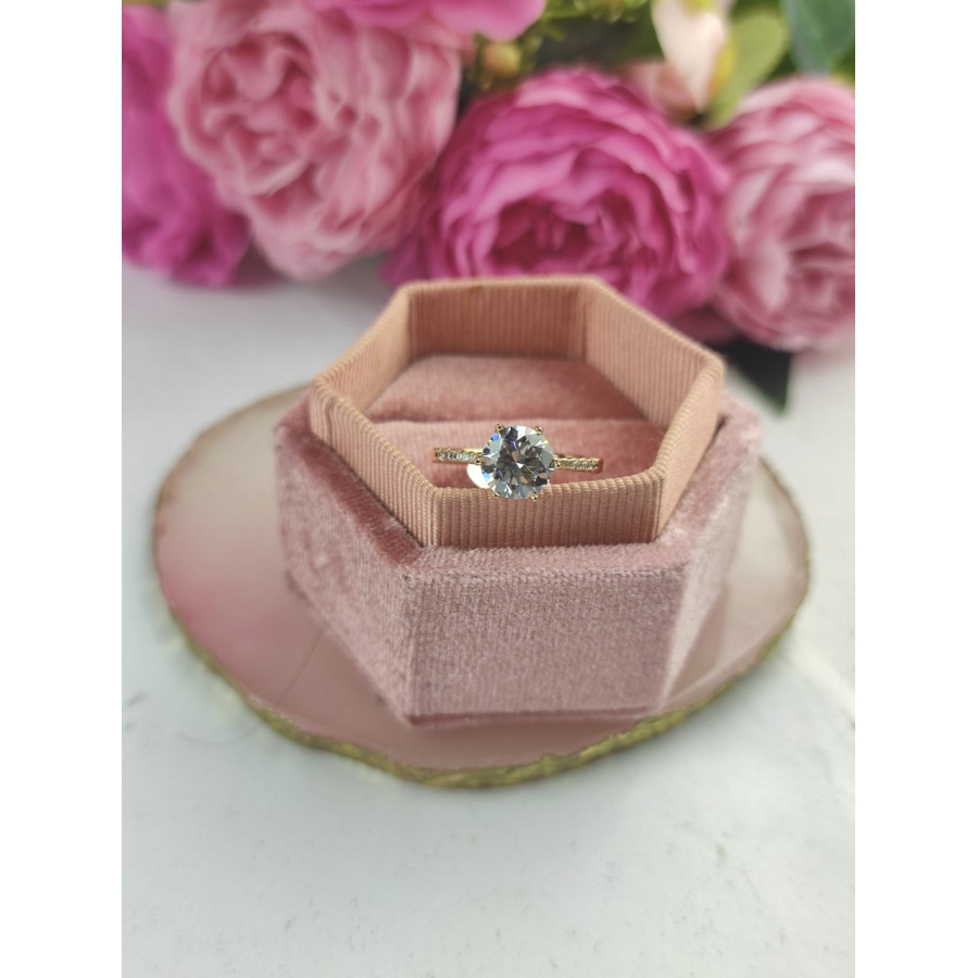 Biżuteria pozłacana, trzykrotnie pokryta warstwą 18-karatowego złota.  Pierścionek w stylu zaręczynowego, z centralnie położonym kryształem, który z każdej strony dodatkowo jest otoczony kryształkami oraz kryształkami po bokach.