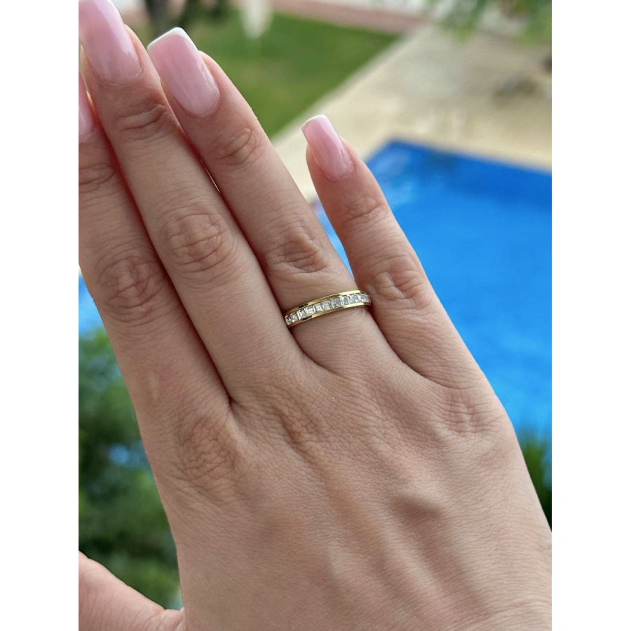 Biżuteria wykonana jest z najwyższej jakości stali chirurgicznej 316, która nie czernieje, nie uczula i jest w 100% hipoalergiczna. Pierścionek elegancki, typu bagieta, ze srebrnymi kryształkami.