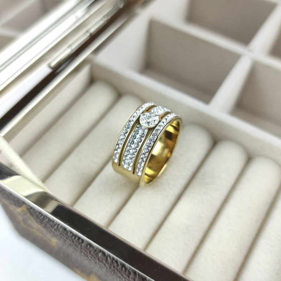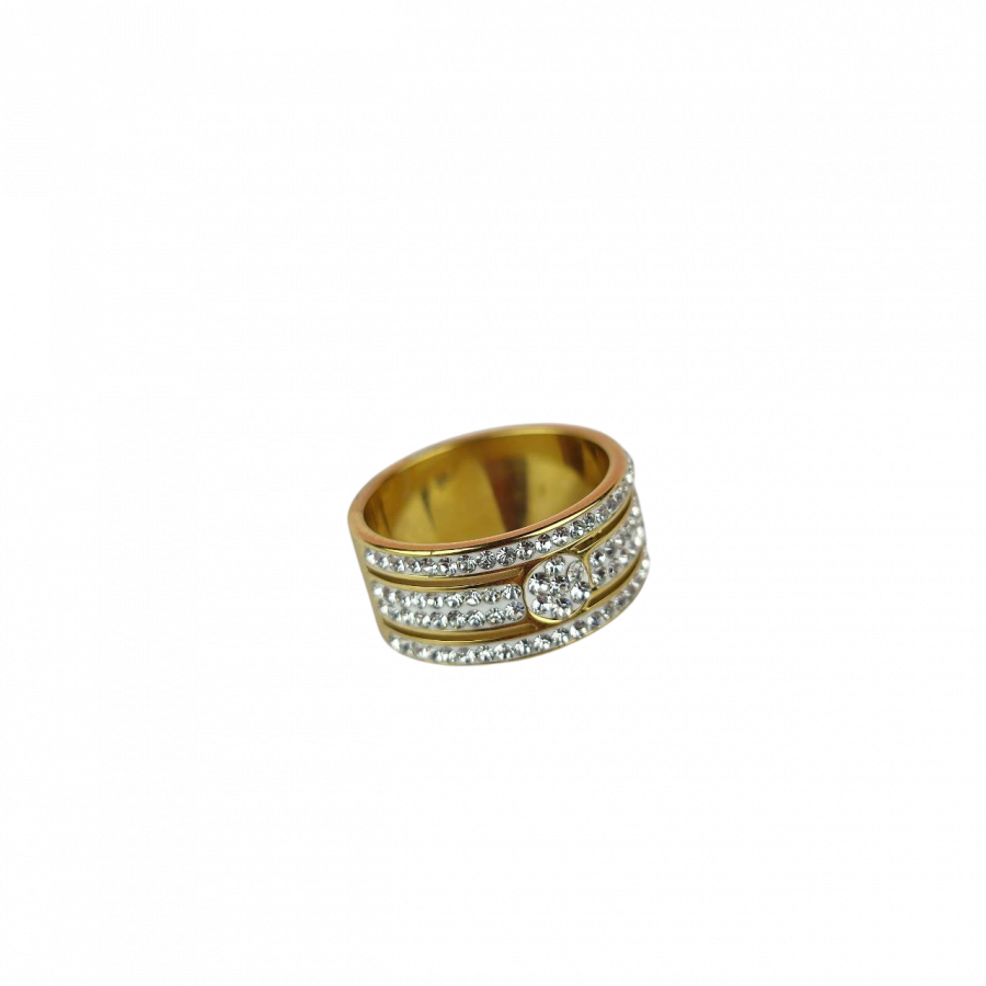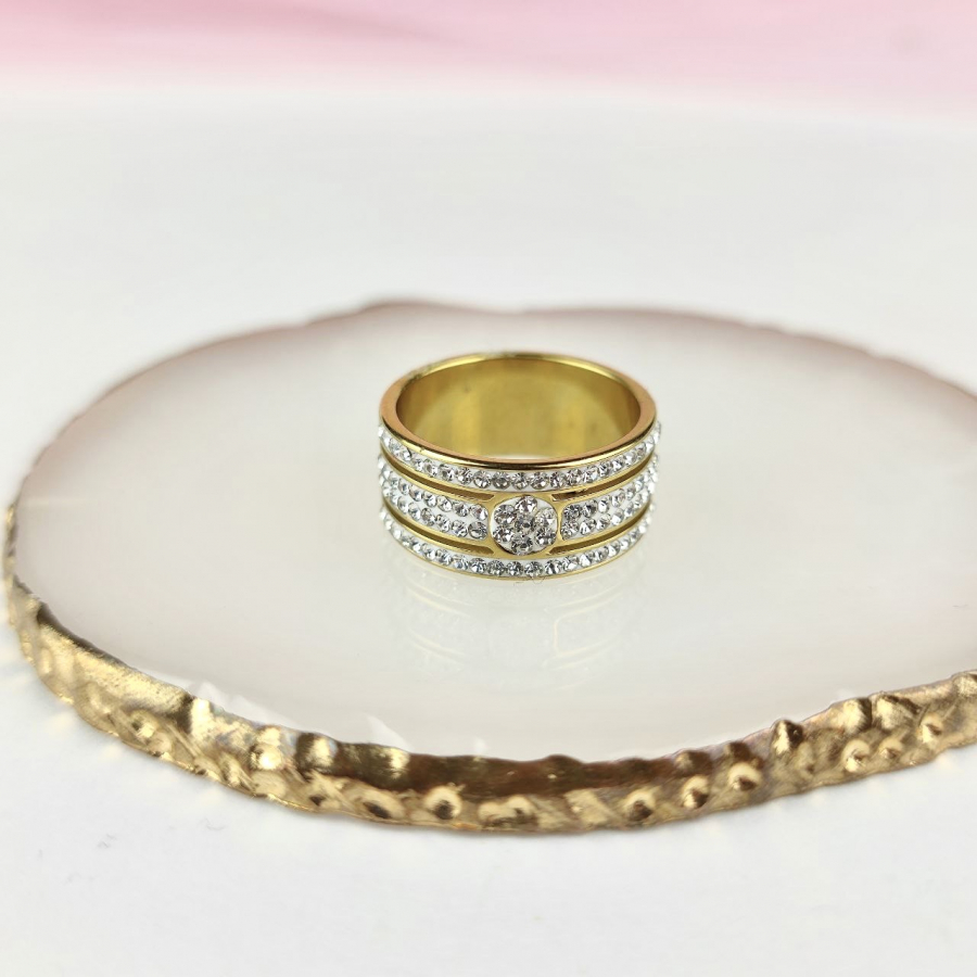 Pierścionek wysadzany czterema rzędami cyrkonii.