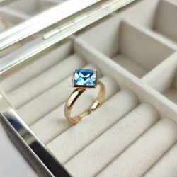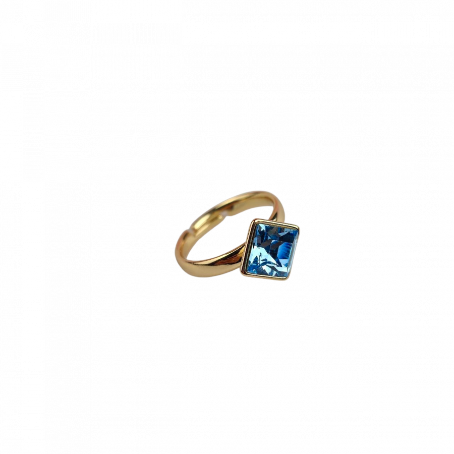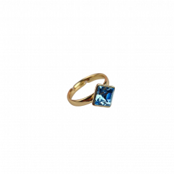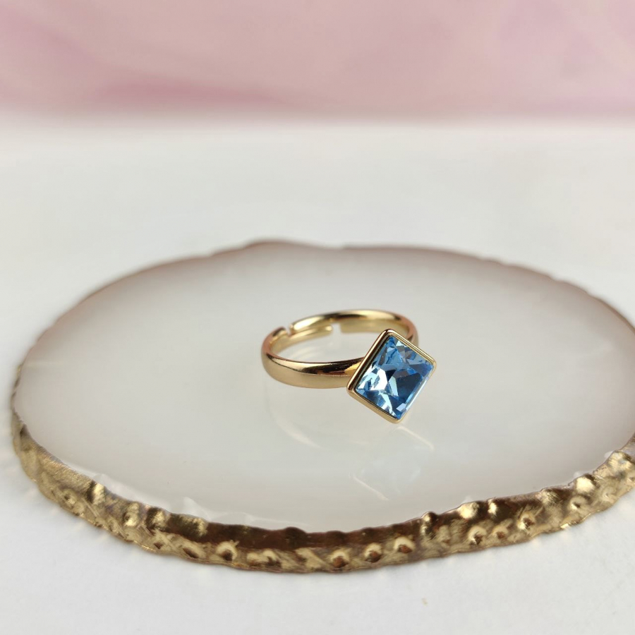 Pierścionek pozłacany, ozdobiony kryształem w kolorze lazurowym. Jest zaciskany, dzięki czemu rozmiar 6 pasuje na rozmiar 6-8, a rozmiar 8 na 8-10.