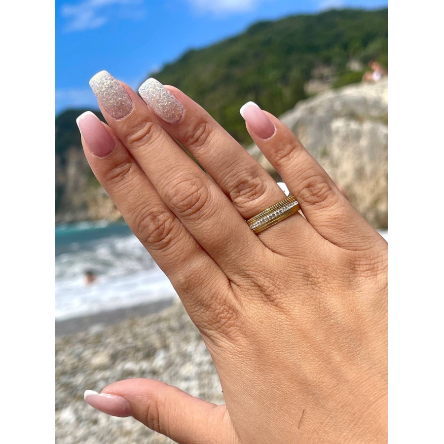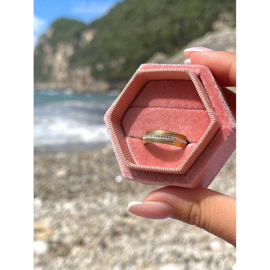 Biżuteria wykonana jest z najwyższej jakości stali chirurgicznej 316, która nie czernieje, nie uczula i jest w 100% hipoalergiczna. Pierścionek typu obrączka, z cyrkoniami pośrodku.