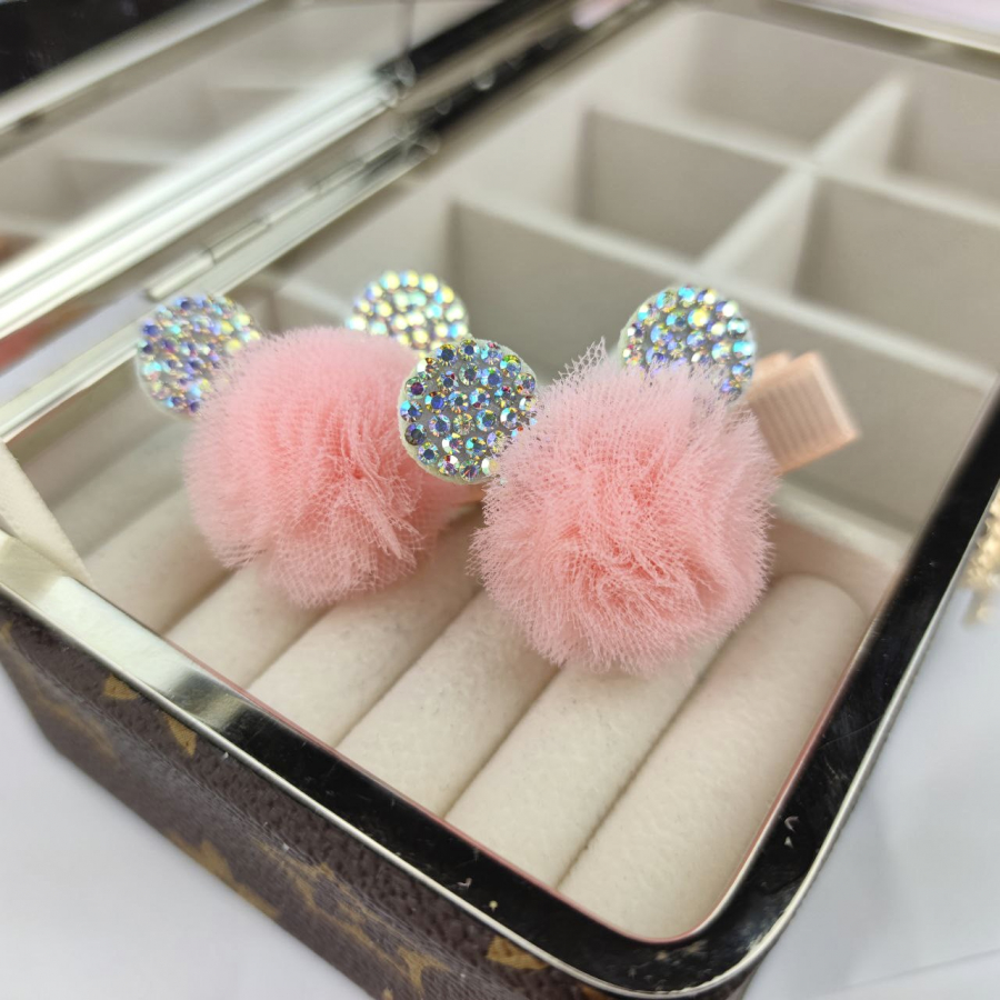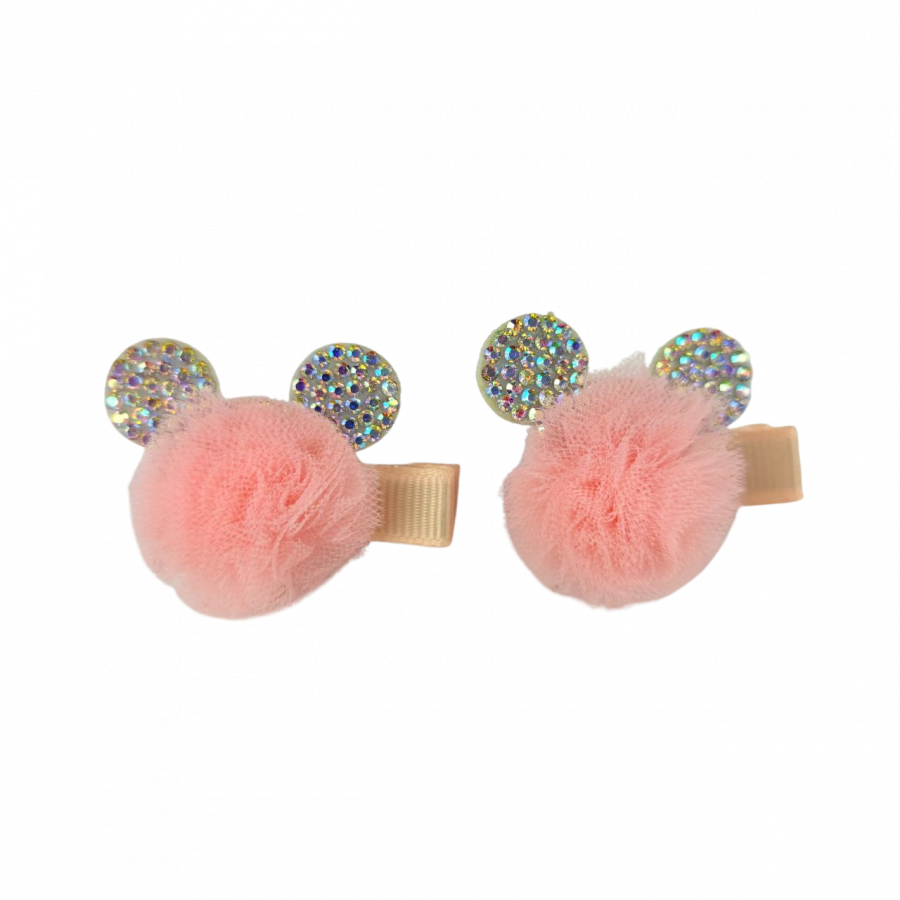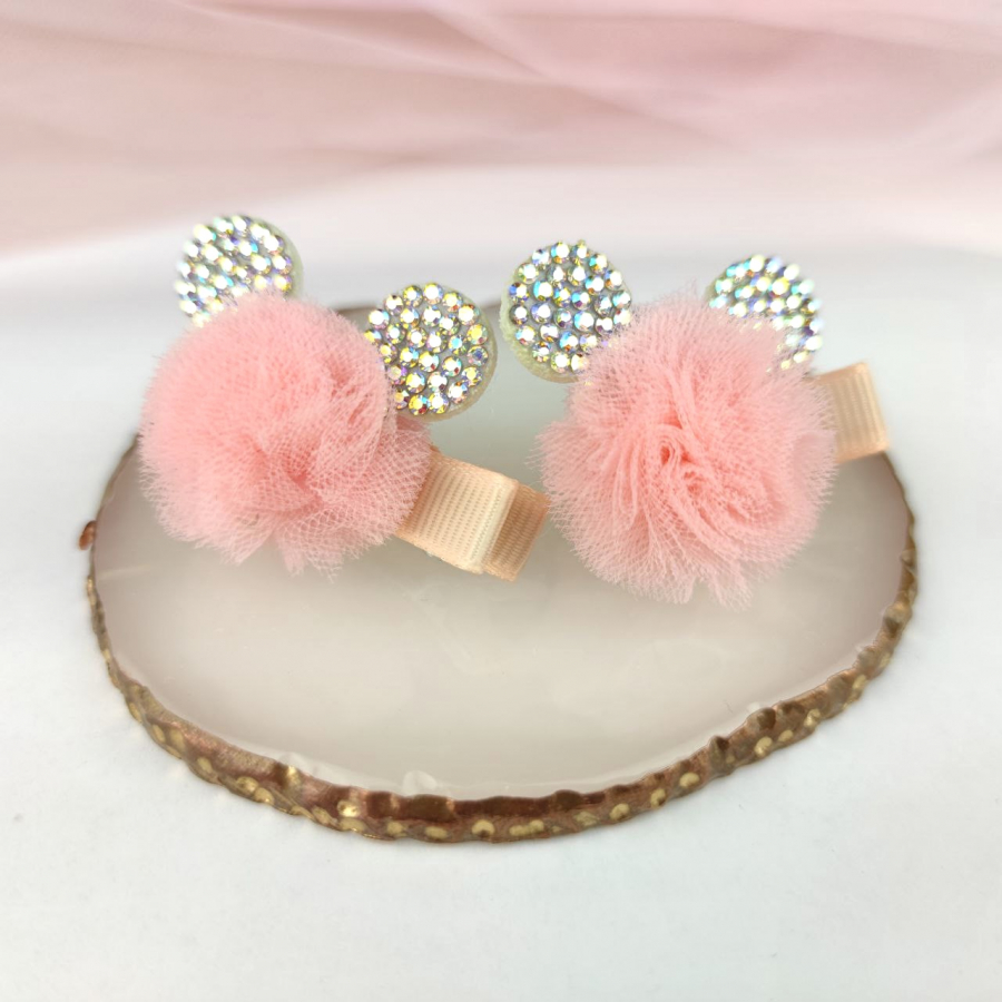 Wyjątkowo urocze spinki tiulowe typu edytka w kształcie główki myszki Micky. Ozdobione cyrkoniami w kolorze multi. Kolor morelowy, pastelowy. Idealne dla dziewczynki. Wysokość 3,5 cm, szerokość3,5 cm. Cena podana za komplet - 2 sztuki.