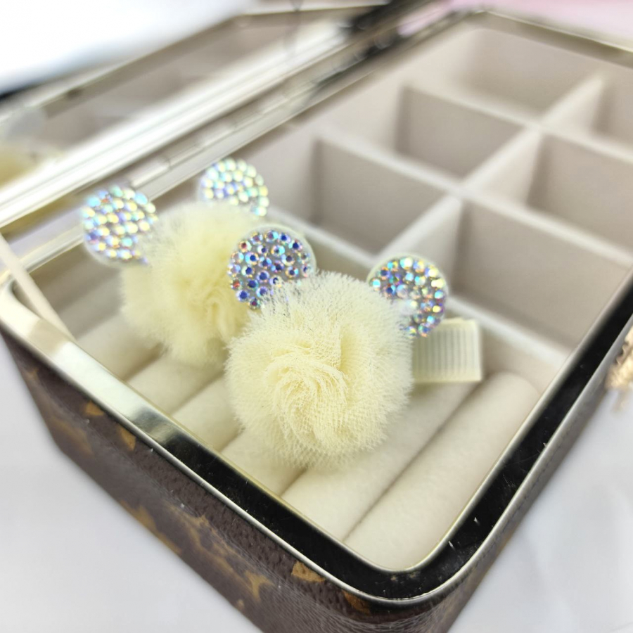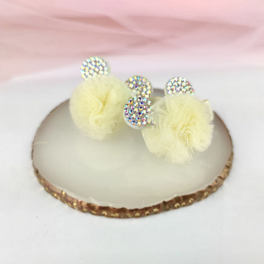Wyjątkowo urocze spinki tiulowe typu edytka w kształcie główki myszki Micky. Ozdobione cyrkoniami w kolorze multi. Kolor żółty, pastelowy. Idealne dla dziewczynki. Wysokość 3,5 cm, szerokość3,5 cm. Cena podana za komplet - 2 sztuki.