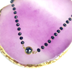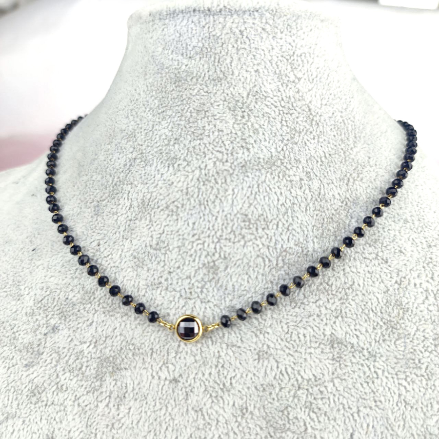 Biżuteria wykonana jest z najwyższej jakości stali chirurgicznej 316, która nie czernieje, nie uczula i jest w 100% hipoalergiczna. Naszyjnik z błyszczącymi, czarnymi paciorkami oraz kamieniem maturalnym - hematytem. Długość 41 cm + 5 cm przedłużka.