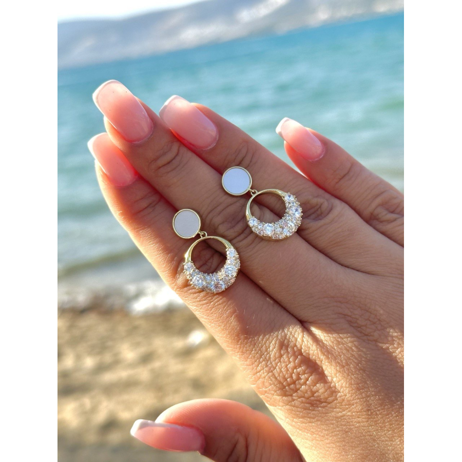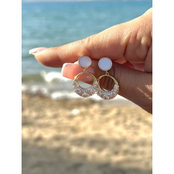 Biżuteria wykonana jest z najwyższej jakości stali chirurgicznej 316L, która nie czernieje, nie uczula i jest w 100% hipoalergiczna. Kolczyki typu sztyfty/wkręty z oponką wysadzaną kryształkami, na górze kólko z masy perłowej. Kolekcja premium - idealnie w kolorze złota próby 585. Cenionej marki Moonriver. Wielkość 2,6 cm.