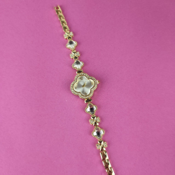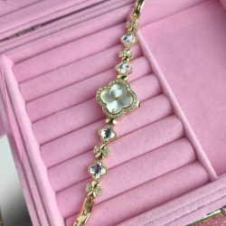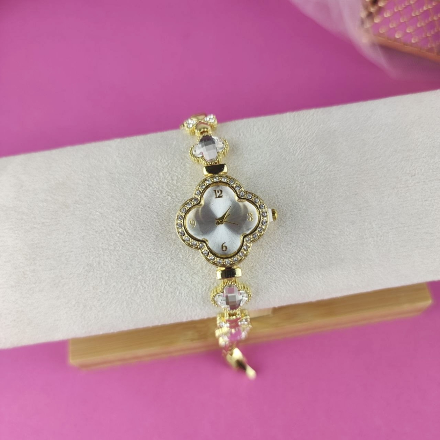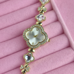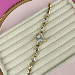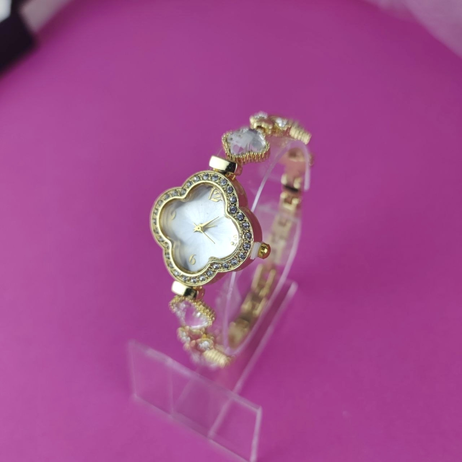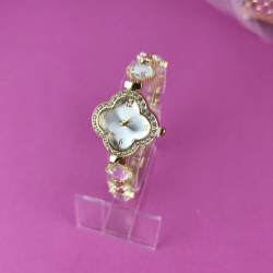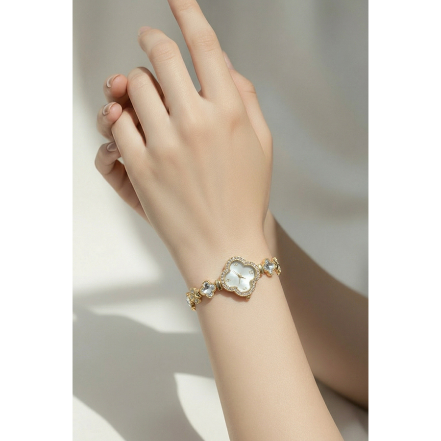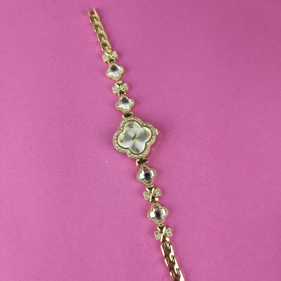 Elegancki zegarek damski w kolorze złotym, który zachwyca subtelnym, biżuteryjnym designem. Tarcza w kształcie koniczyny ozdobiona jest delikatnymi cyrkoniami, a bransoleta wyróżnia się czarnymi elementami w formie czterolistnych motywów, nadając całości wyjątkowego charakteru i klasy.