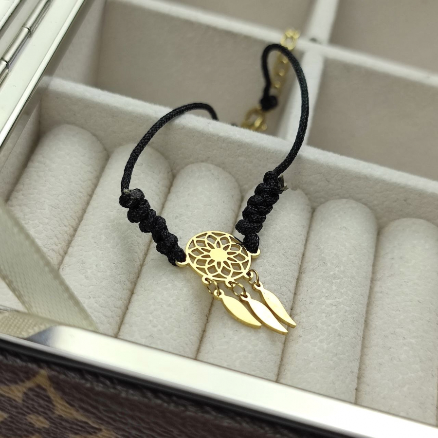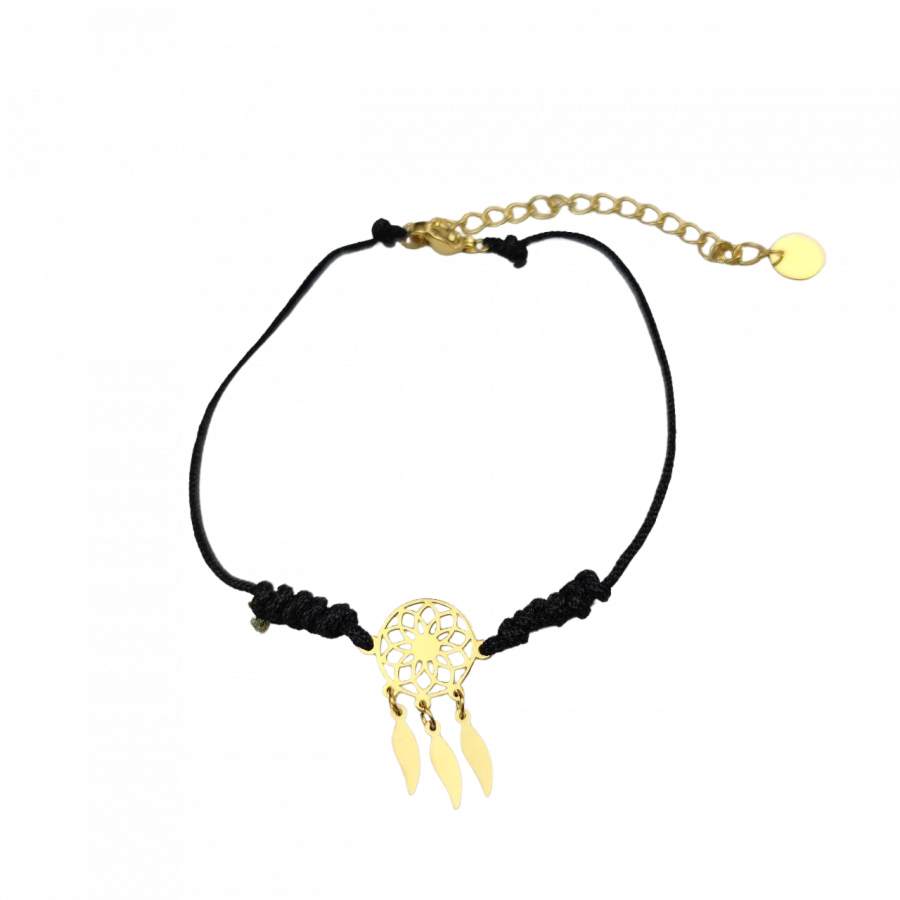 Bransoletka Moonriver, z motywem łapacza snów. Na czarnym sznurku, złote elementy wykonane ze stali chirurgicznej. Długość 17,5 cm + 5 cm przedłużka.