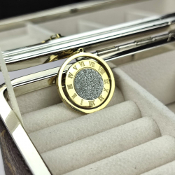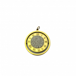 Zawieszka obrotowa, dwustronna. Z jednej strony srebrny brokat, z drugiej ciemniejszy, grafitowy. Wykonana ze stali chirurgicznej. Obustronnie grawerowane rzymskie cyferki. Możliwość idealnego dopasowania do stylizacji, z zależności czy potrzebujemy jasnej czy ciemnej biżuterii.