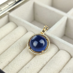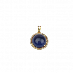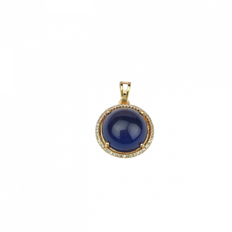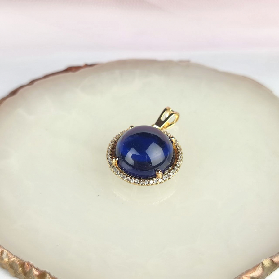 Biżuteria pozłacana, trzykrotnie pokryta warstwą 18-karatowego złota. Zawieszka okrągła, z granatowym środkiem, ozdobiona naokoło cyrkoniami. Średnica 1,9 cm.