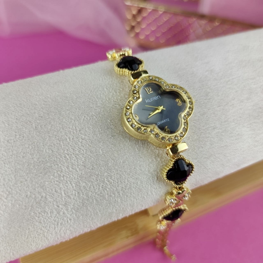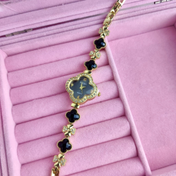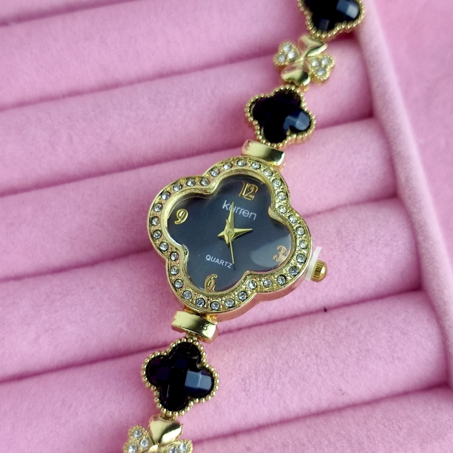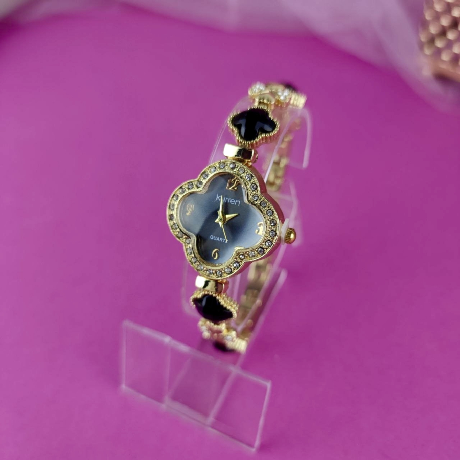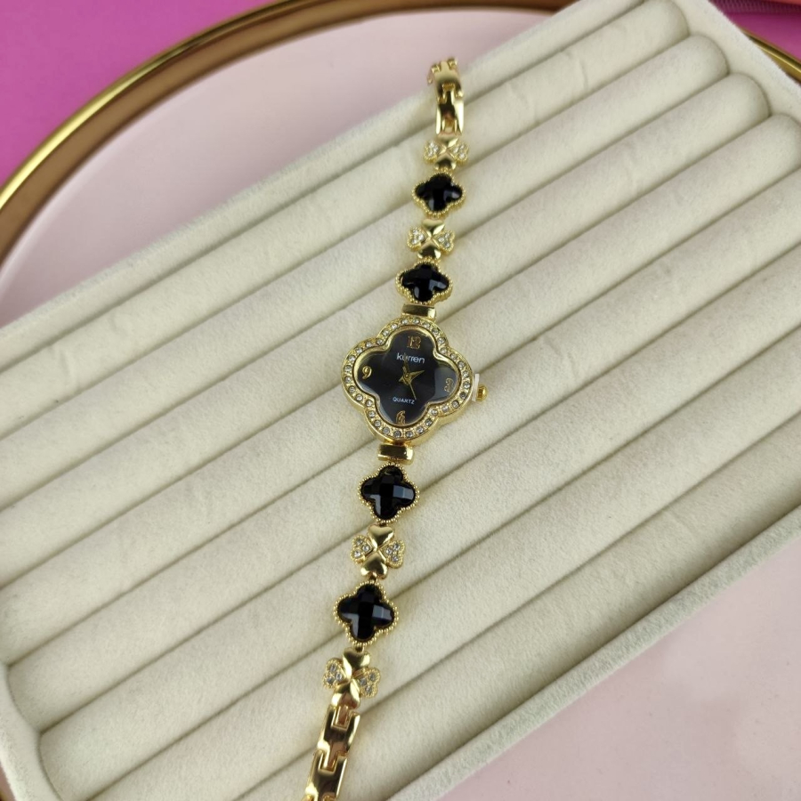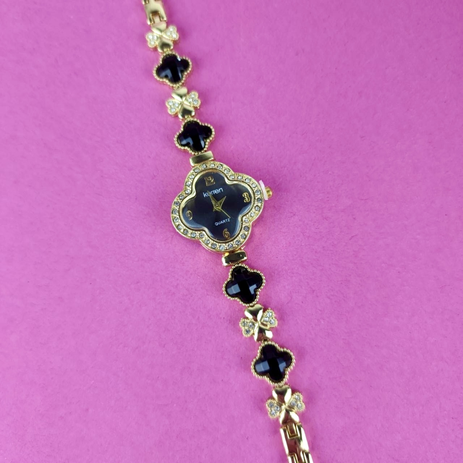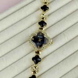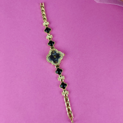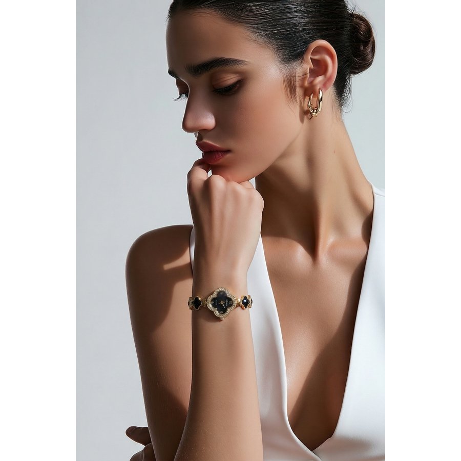 Elegancki zegarek damski w kolorze złotym, który zachwyca subtelnym, biżuteryjnym designem. Tarcza w kształcie koniczyny ozdobiona jest delikatnymi cyrkoniami, a bransoleta wyróżnia się czarnymi elementami w formie czterolistnych motywów, nadając całości wyjątkowego charakteru i klasy.