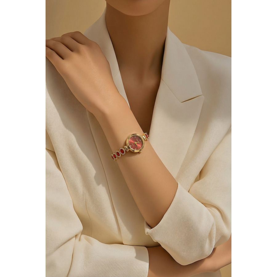 Stylowy zegarek damski w złotym kolorze to połączenie elegancji i biżuteryjnego designu. Subtelna, okrągła tarcza w czerwonym kolorze została ozdobiona delikatnymi cyrkoniami, które pełnią funkcję indeksów godzinowych, nadając całości szyku i kobiecego blasku.